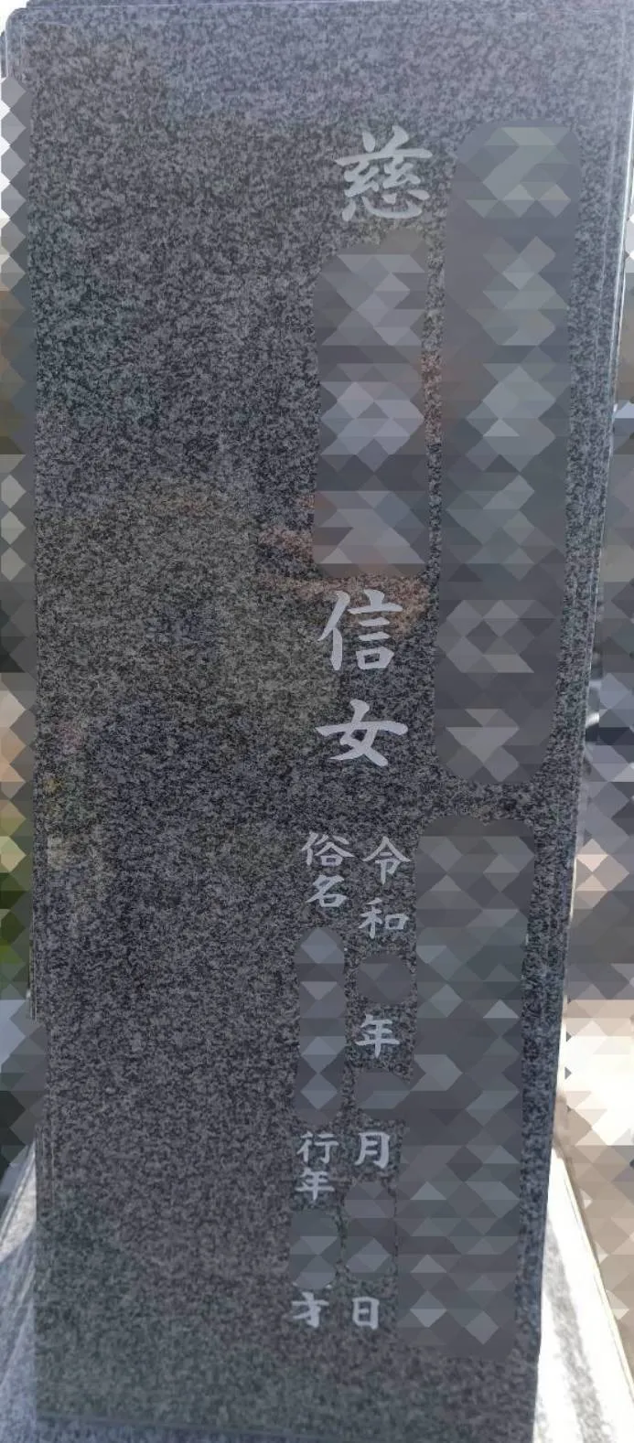 今回は本体の竿石の向かって右面の2名目へ戒名と没年月日、俗名、行年を彫刻しております。